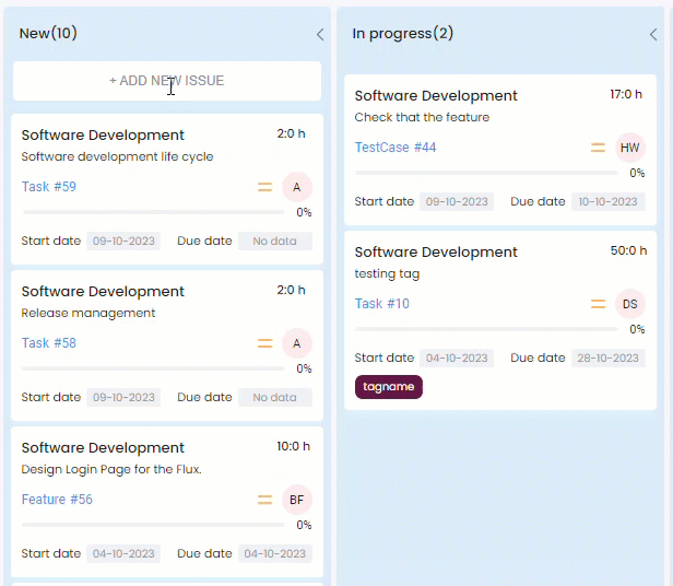 “Add New Issue” input field (usually denoted by a“+” symbol) and type task subject and press“Enter” key to add new task in the Agile Board. - The task will now appear as a card within the corresponding column on the Agile Board.