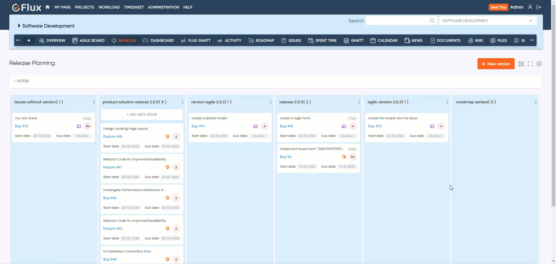 - Once the Agile board modules are enabled, see a “Backlog” tab next to the “Agile Board” tab. Click on the “Backlog” tab to view the version planning board.