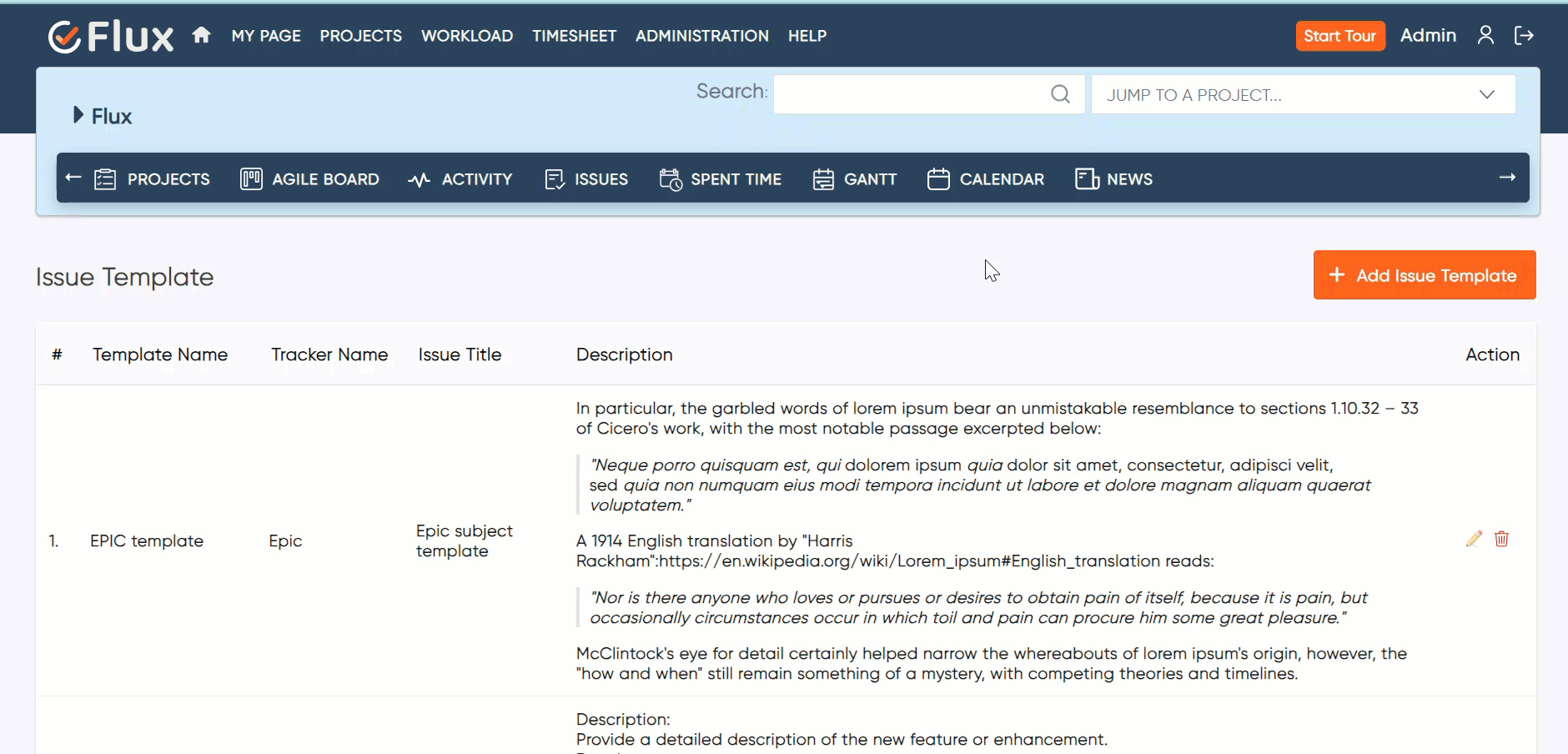 “Issue Template” tab. - Display the issue template page where users can add new templates, submit templates, edit existing ones, and delete templates for particular projects.