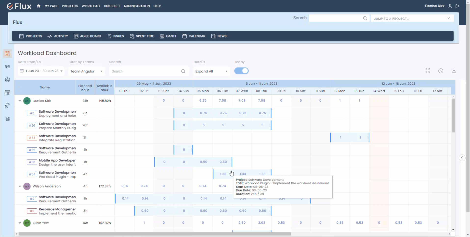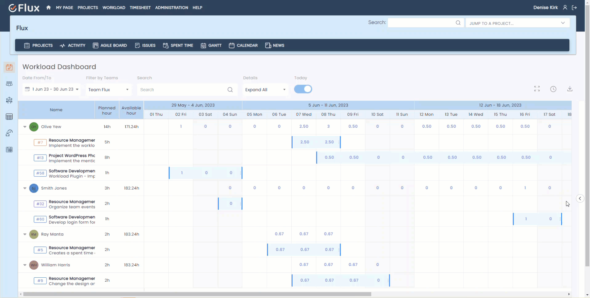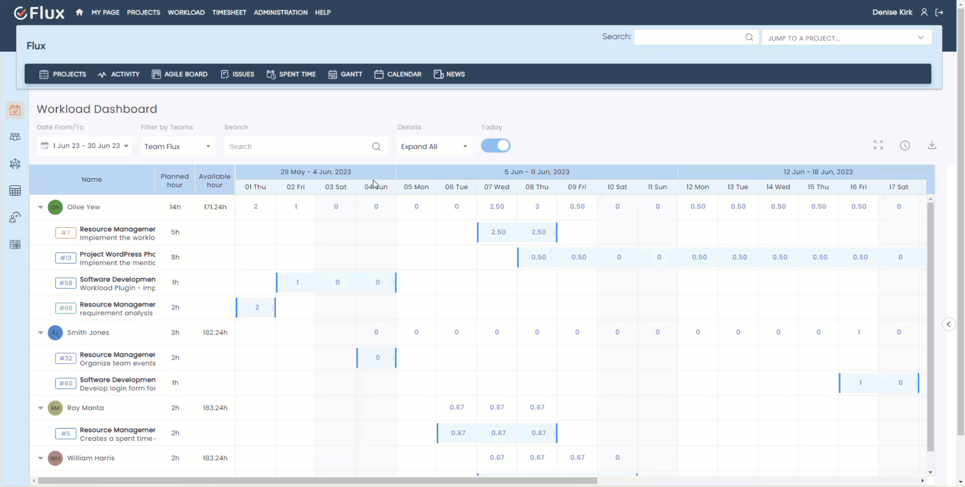 The Redmineflux Workload plugin is a powerful tool that helps you manage your team’s resources and capacity. It allows you to track estimated time on tasks, create resource schedules and visualize workload. The plugin visualizes workload by showing you how much time each resource has available. This helps you to identify potential bottlenecks and ensure that your team is not overloaded.